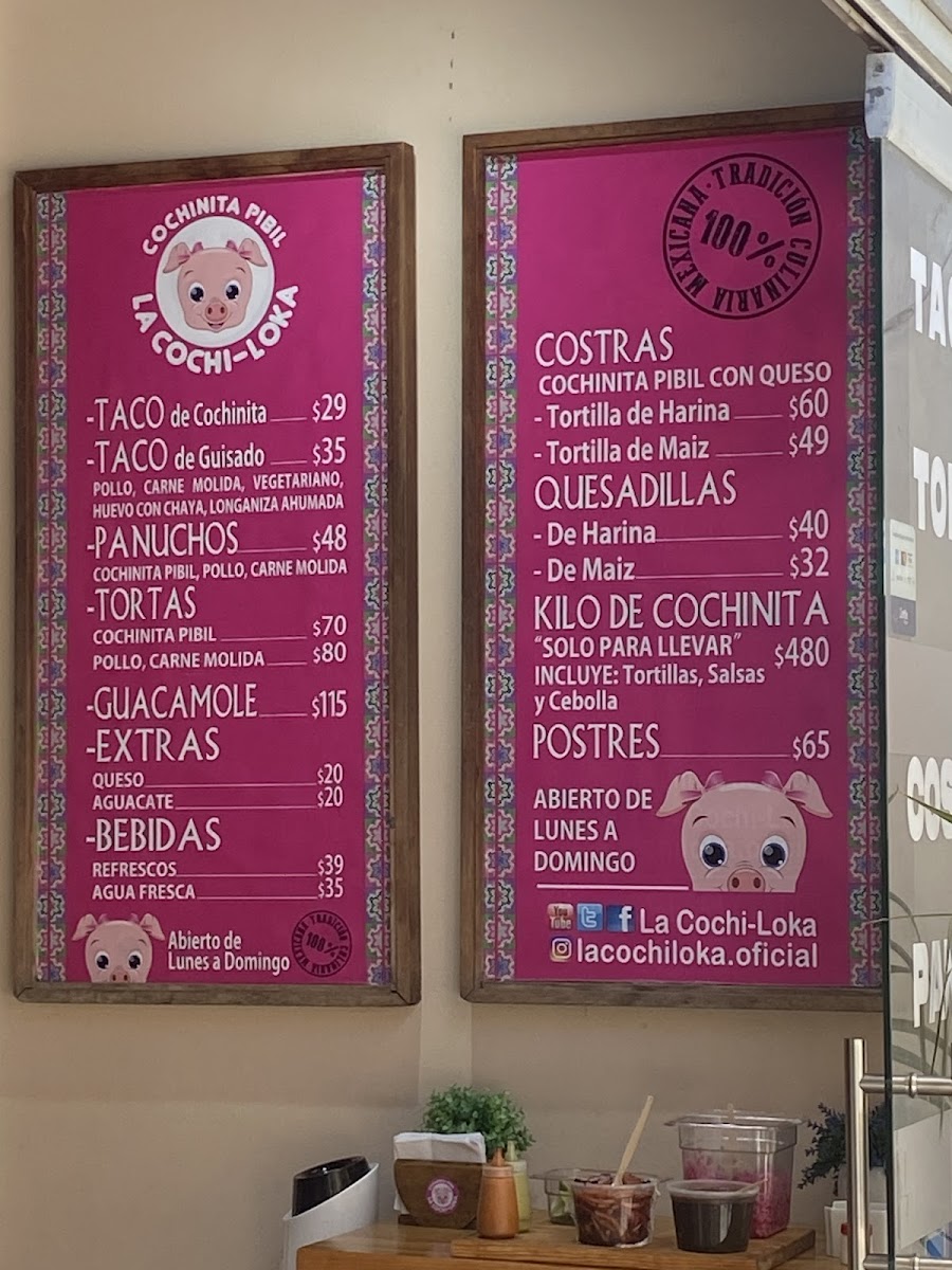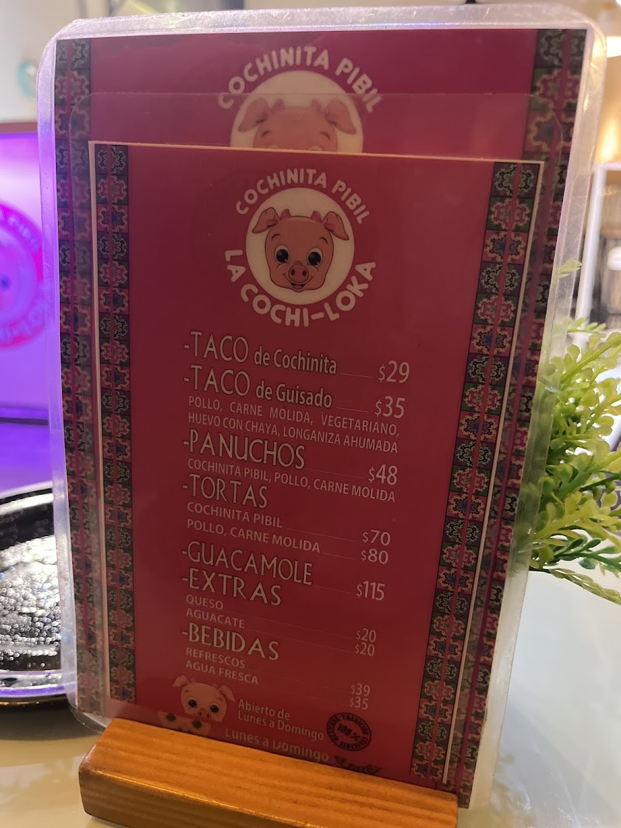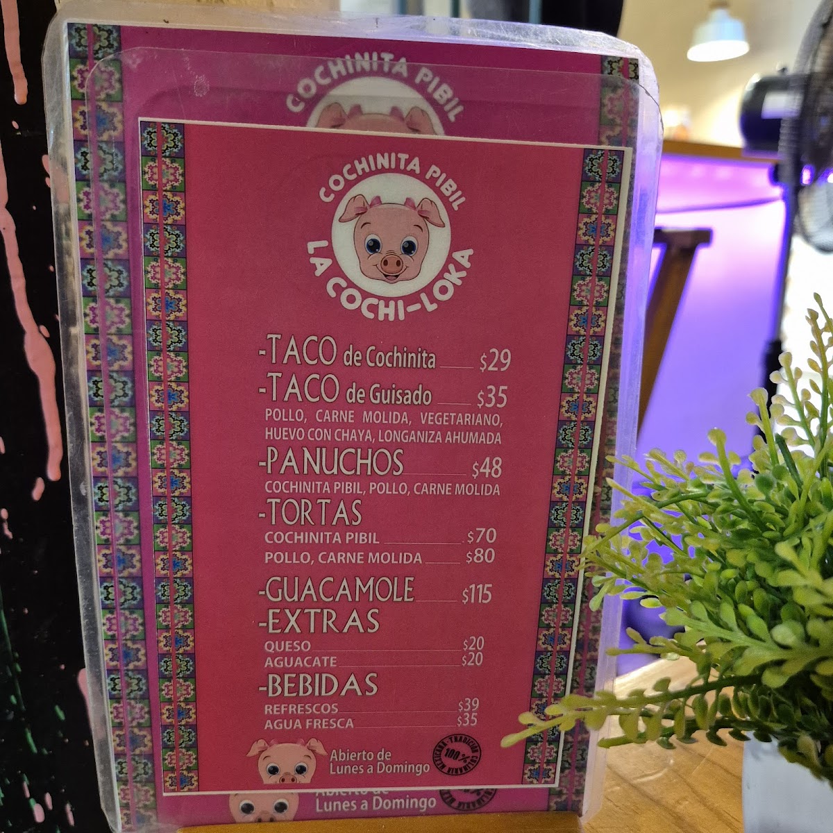 The menu offers a variety of traditional Mexican fast food items with a focus on cochinita pibil, a popular regional specialty. Customers can find a diverse selection of tacos featuring cochinita pibil, pork, and other fillings, as well as tortas (Mexican sandwiches), panuchos, salbutes, and quesadillas. Many dishes highlight cochinita pibil either as a main ingredient or paired with other options like chicken or cheese.