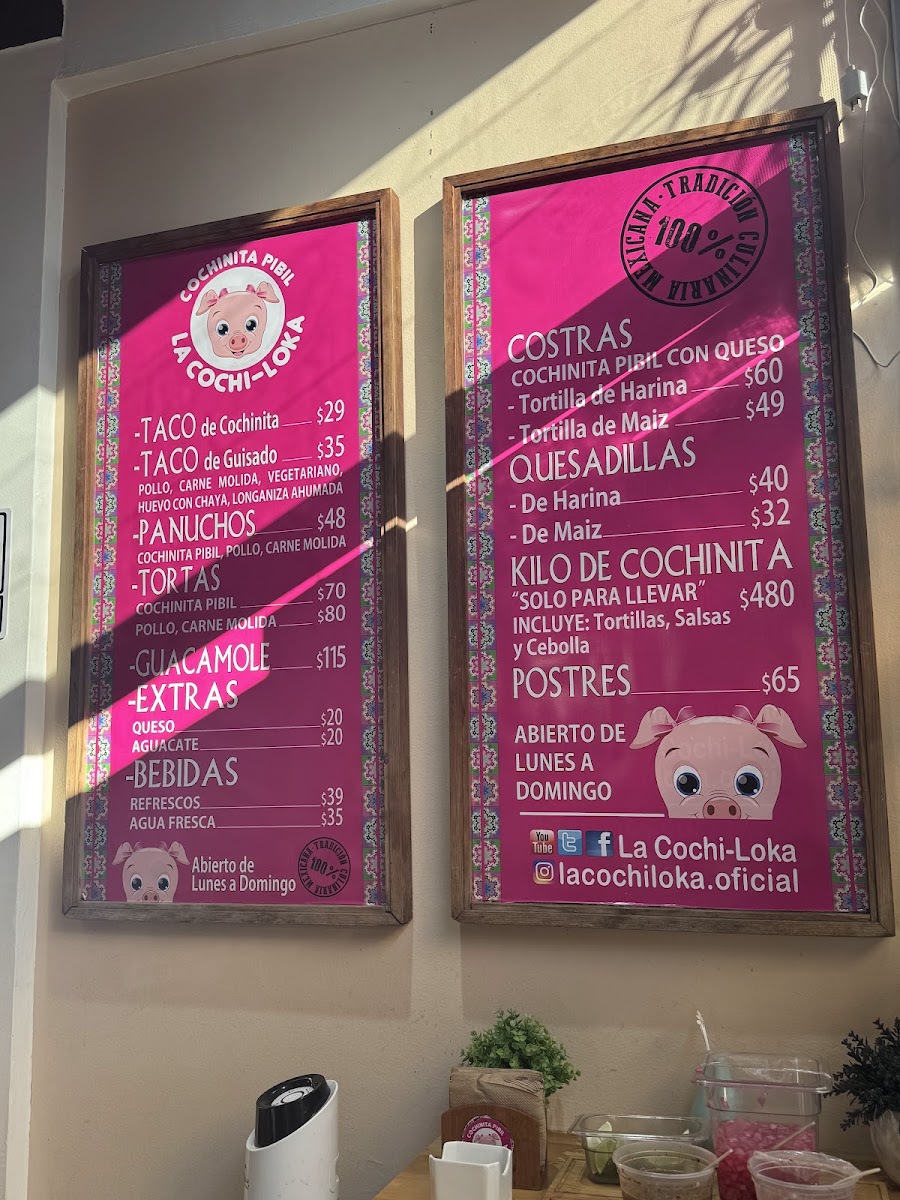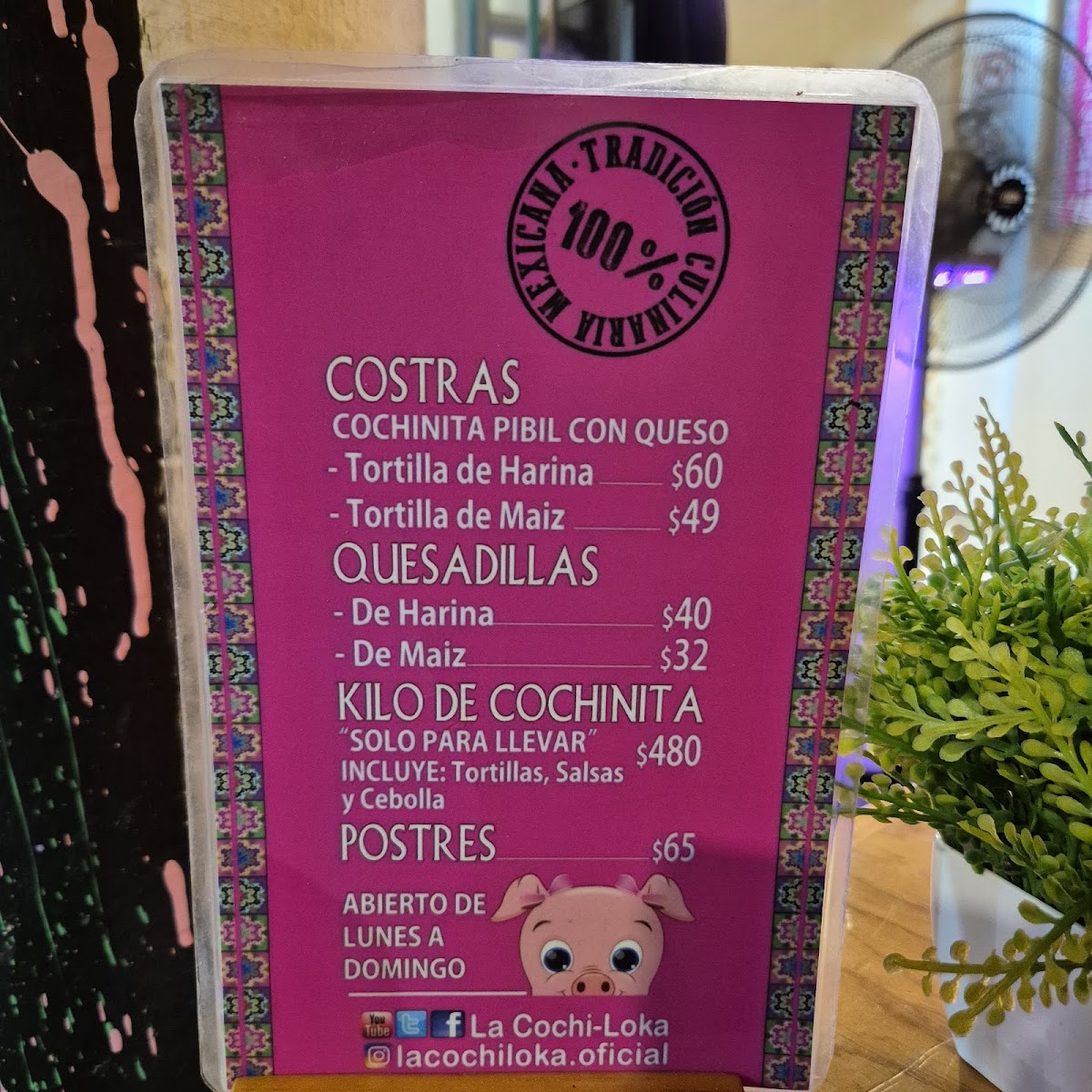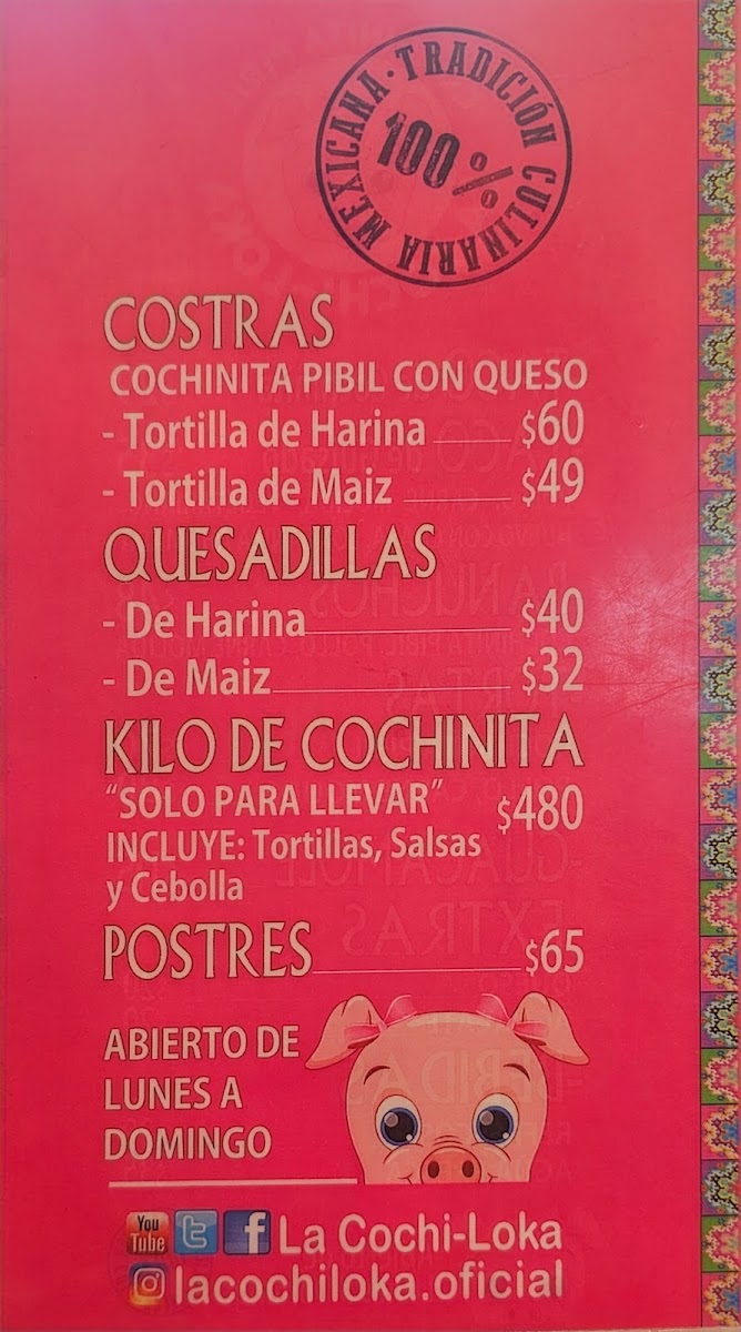The menu offers a variety of traditional Mexican fast food items with a focus on cochinita pibil, a popular regional specialty. Customers can find a diverse selection of tacos featuring cochinita pibil, pork, and other fillings, as well as tortas (Mexican sandwiches), panuchos, salbutes, and quesadillas. Many dishes highlight cochinita pibil either as a main ingredient or paired with other options like chicken or cheese.