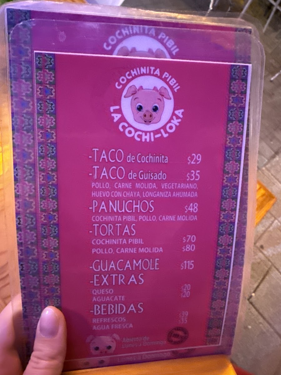 - Tacos: Various styles such as cochinita pibil tacos, pork tacos, and veggie options.